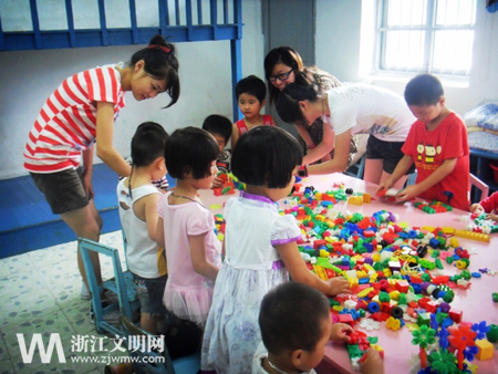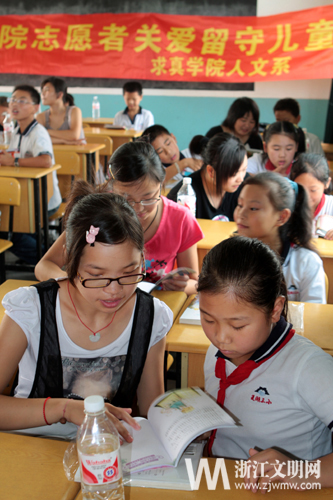 关爱留守儿童,一直是湖州师范学院师生长期坚持的。2011年夏天,“幸福手拉手”实践服务团作为浙江省唯一一支团中央重点团队,走进四川省乐山市犍为县,为当地儿童开设了岷江畔的夏令营。支教团队由8名学生,3名老师组成。为使支教活动更加务实,师院的师生们给异乡的小朋友们带去的不仅仅是课本知识,更多的是学习方法以及诸如绑鞋带之类的生活技能。
