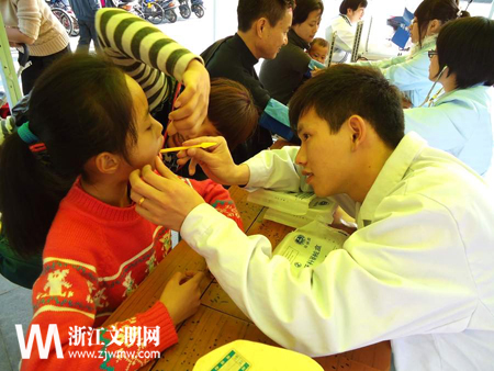 志愿者为儿童进行口腔检查