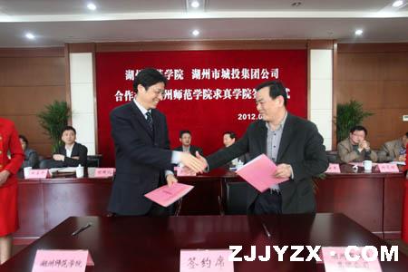 2012年3月29日,浙江教育在线以《湖州师院与湖州市城市投资集团公司合作办学》为题,详细报道了我校与湖州市城市投资集团公司合作举办求真学院的签约仪式。全文如下: