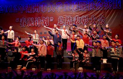 发现美,储存爱,我们去支教, 2012年湖州市大学生暑期社会实践“春泥计划”总结表彰大会,日前在情景剧《春泥故事》的表演中拉开帷幕。“春泥”志愿者创新形式,把春泥支教活动中温暖、感人的一幕幕搬上了舞台。 3年来,湖州师院累计组织了620余名志愿者,到吴兴区、南浔区、德清县义务支教,活动覆盖百余个行政村,近7000余农村未成年人受益。