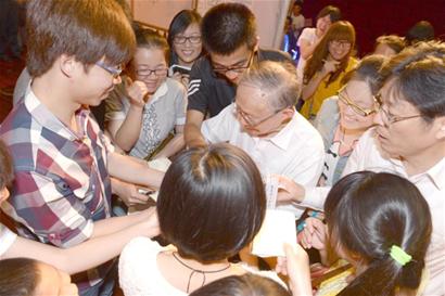 5月21日晚,中国科学院院士、著名机械工程专家、教育家杨叔子来到湖州师院讲课,受到了师生的热烈欢迎。图为80岁的杨老正热情地为“粉丝”签名。