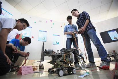 上周五,湖州大学生科技作品展在湖师院展览厅举行,科技作品涉及机械、电子、物理、医学等各个学科在内的共36个作品。涉及面广、趣味性强、学生参与度高,经过一天的评选投票,最终评选出最佳创意、最佳成果和最受欢迎奖。图为学生在展示他们团队制作的“排除万难”机器人。