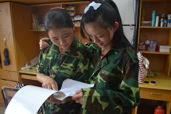 为让新生在军训中锻炼意志品质的同时留下属于自己的青春专属记忆,并作为一份纪念终生保留,湖州师范学院给每位学生发放了军训日记本。图为九月十二日午休期间,学生在宿舍互相传阅彼此的军训心得。