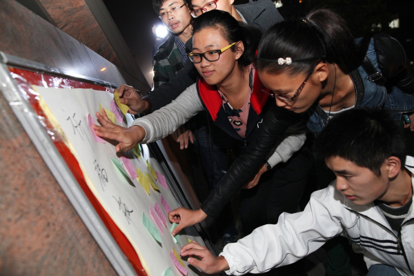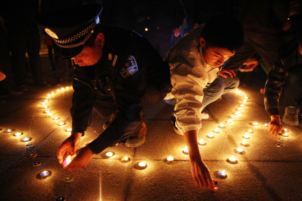 昨晚,在湖州师范学院恩泽碑广场,百余支蜡烛摆成一双托起爱心的双手,现场师生和学校保安围成一圈,为“最美保安”李迎福祈福,祝愿他早日康复。 记者 李怿鼎 摄
