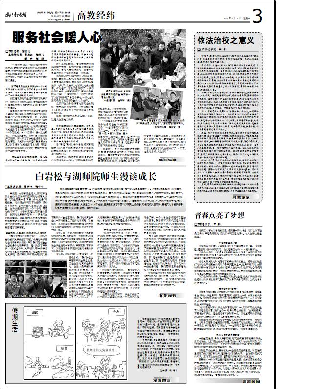 2014年2月24日,《浙江教育报》高教经纬版以《白岩松与湖师院学生漫谈成长》为题,报道上学期白岩松做客胡瑗大讲堂的讲座情况。如下: