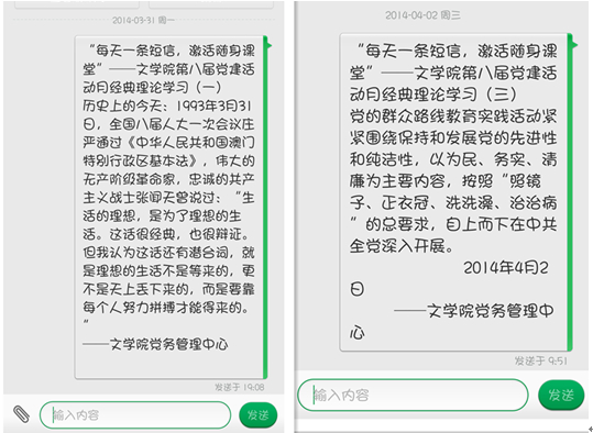 近日,随着湖州师范文学院党建与思想政治教育活动月的开展,学生党员开创经典理论学习新途径,通过党员之间每天一条短信的互传,以最亲近的方式,传达党的理论,激活党性修养。短信内容包括党章理论节选、历史上的今天、重要时事政治、优秀共产党员经典语录等。学生党员表示非常乐于接受这种便携式的理论学习方式,在平常忙碌的学习工作之余,一点一滴地接受红色信息的熏陶,在弘扬红色主旋律的同时不断提高自身政治理论素养,逐渐构筑自身社会主义核心价值体系,坚定永远跟党走的信念。