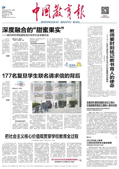 2014年5月17日,《中国教育报》头版头条以《深度融合的“甜蜜果实”——湖州师范学院服务地方经济社会发展纪实》为题,对我校服务地方经济社会发展工作进行了重点报道。全文如下: