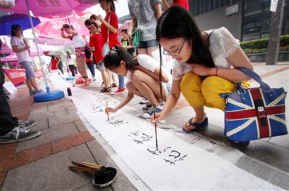 昨天上午,由湖州师院信息工程学院暑期社会实践队开展的“湖笔绘湖城,公益天下行”活动在湖城爱山广场举行。活动现场,我市书法家、书法爱好者与过往市民一起挥毫泼墨,书写百米长卷。