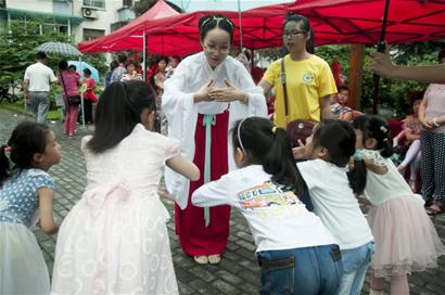 7月2日晚,湖城市陌二社区,身着汉服的大二学生李周诺讲述汉服文化、简单教习汉代礼仪,吸引了大批小朋友跟着模仿。几个来自岐黄社的湖师学子也在一旁给居民讲述花茶功效,还现场泡制花茶供人品尝。“平时比较忙,都没有时间去参加文化活动,但这次活动却让我很感兴趣。”一位居民说。