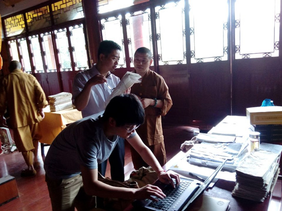 为按时、顺利完成这次普查任务,经过市文物局协调,市民宗局和市普查办协商,由市普查办、师院合作,利用暑期时间,由湖州师院两位教授带领历史专业学生,对经书进行整理归类,帮助寺院摸清《大藏经》和其他经籍,形成藏品目录,完成万寿禅寺《大藏经》等普查整理工作。