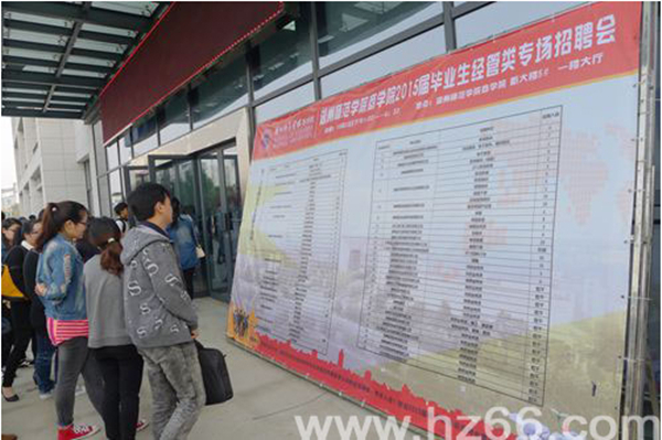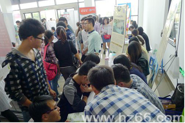 10月22日下午13点,湖州师范学院商学院2015届毕业生经管类专场招聘会在商学院新大楼一楼大厅内举行。来自上海、杭州、宁波、广州、成都以及湖州本地共50多家单位带着近1000个岗位来到学校招揽人才,前来应聘的学生络绎不绝,现场火爆非常。