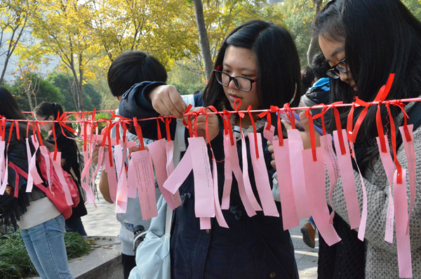 在第27个“世界艾滋病日”来临之际,11月26日中午,湖州师范学院医学院阳光医疗服务团联合该市疾控中心、市中心血站等单位,开展艾滋病日宣传活动。图为活动现场,学生们用挂红丝带的方式表达对艾滋病患者的关心与祝福。(本报通讯员 殷淑琴 董建新 摄)