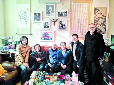 徐重庆先生(左二)与湖州市文广新局局长宋捷(左四)等看望赵景心先生(左三)。供图:湖州市文广新局