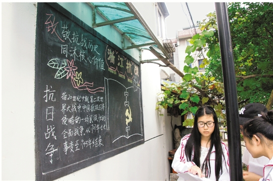 2015年7月15日,《浙江日报》00013版报道了我校商学院“致敬抗战历史,同沐核心价值”暑期实践团前往湖州墙壕里小区宣传爱国主义精神的情况,全文如下: