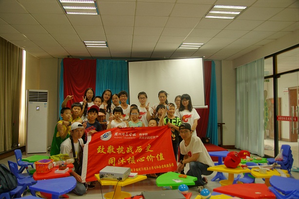 为缅怀不朽历史,宣传爱国主义教育,践行“爱国、进步、民主、科学”的先进核心价值观念,以抗战胜利70周年为契机, 7月15日,湖州师范学院商学院“致敬抗战历史,同沐核心价值”社会实践团的18名学生党员携手余家漾社区,带社区暑托班的孩子重唱抗日史,同沐核心价值。