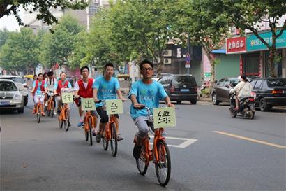 7月15日,一支挂有“绿色出行”四个字的公共自行车队穿梭在湖城的大街小巷,引起市民关注。据了解,他们都是湖州师范学院环保小组的成员,借暑期实践的机会,通过自行车骑行、商贸区拉横幅、填写调查问卷等方式宣传环保理念,倡导绿色出行,得到广大市民的积极响应。见习记者 孙文斌通讯员 楼子谦 摄