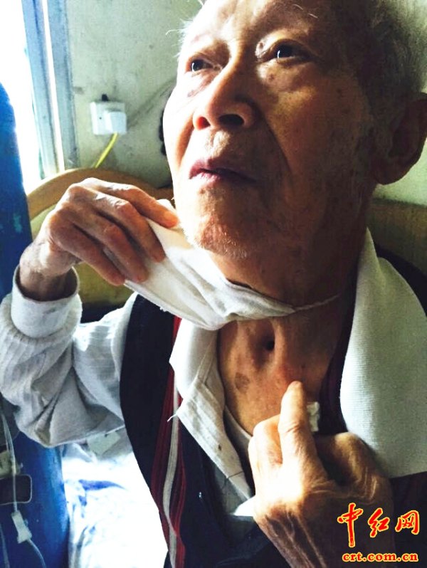 抗战胜利后,远离战争的老人却不幸罹患喉癌,声带被切除已达40余年,唯有依靠空气进到肾管里振动发声,但老人始终保持乐观,自主研究针灸等保健知识,还兴奋地向团队成员表示:“我现在94岁了,我要一直活到120岁!”