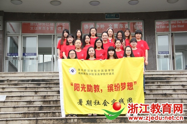 浙江教育网讯:烟雨笼罩的湖州的七月天 ,迎着湖州前几天恶劣的天气, “阳光助教,缤纷梦想”实践团队终于在今天七月七号这个特别的日子里踏上了前往嘉兴海宁的道路。一大早他们便早早的来到了湖州师范学院外国语学院的门口集合,整齐的服装,统一的行李,整装待发的他们。他们在大门口留下了属于他们的缤纷回忆,用相机记录下了属于他们的启程之路。辗转两地的前期拍摄是他们为助教之旅填上了精彩的一笔。