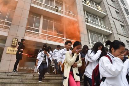 11月4日,湖州师范学院2015年灭火和应急疏散预案演练在湖州师范学院图书馆举行。湖州师范学院以及湖州消防支队特勤中队等单位参加了此次活动。图为学生正在疏散引导员的引导下撤离至安全区域。 见习记者江云开摄。
