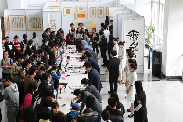 开幕式后,嘉宾和师生们来到图书馆大厅欣赏艺术学院范斌教授与校友的书法秀。范斌教授在现场挥毫泼墨,气定神闲地写下八个大字 “君子尚读 以美其身”。校友骆炜、王忠、朱茂芝、柯用叨、张怀也展示了自己的书法才艺。其中一个女孩吸引了大家的注意,她叫苑丹青,2007年毕业于我校,师从范斌教授,用功于秦汉玉印,书法主攻褚遂良雁塔圣教序,多次获得篆刻和书法奖。她与师父范斌一左一右、一师一徒,让现场观众看到了传承与发扬,也激起了师生们对书法的热情。