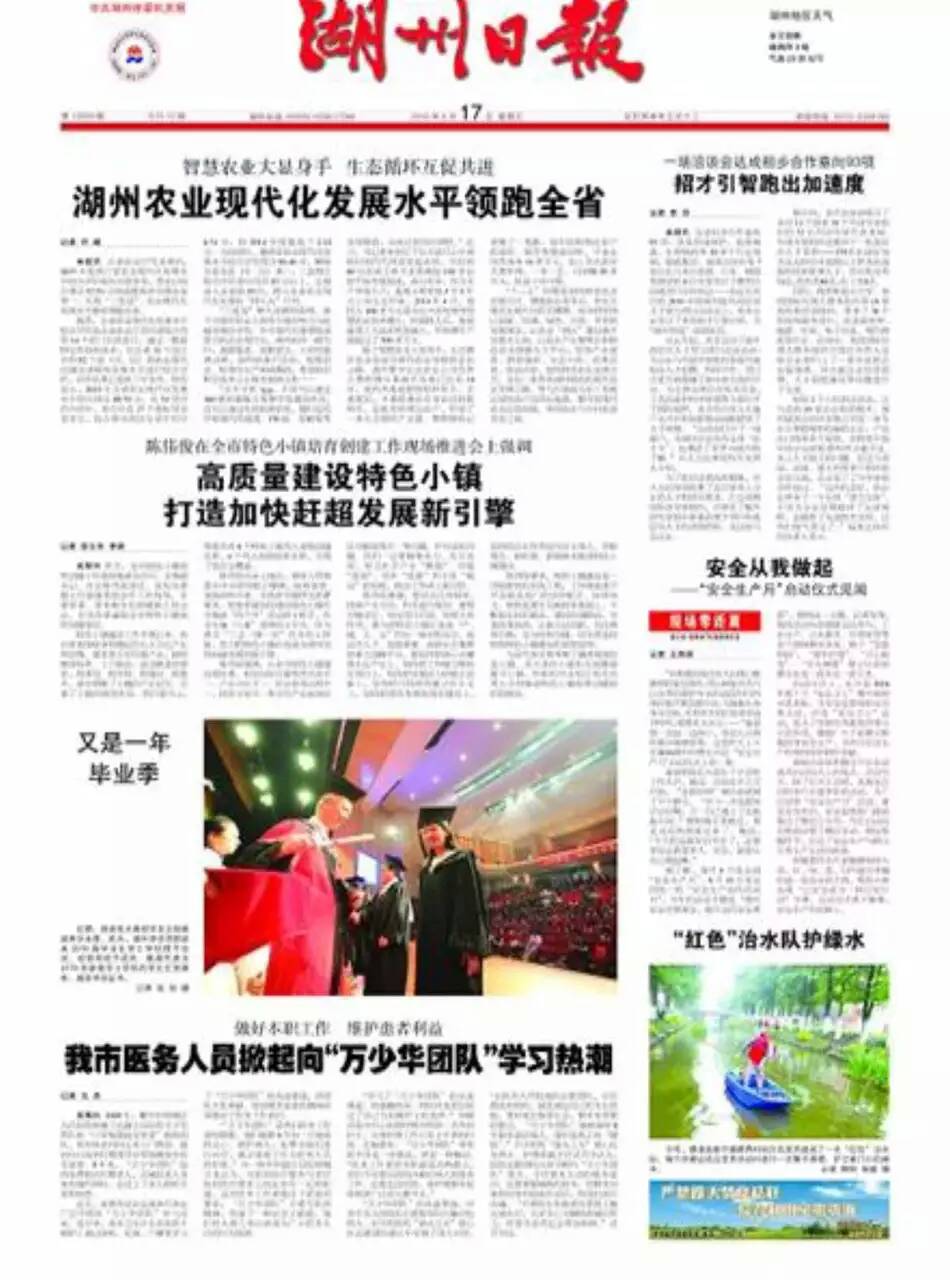 2016年6月17日,《湖州日报》头版以《又是一年毕业季》为题,图片新闻报道我校2016届毕业生学士学位授予仪式。图文如下: