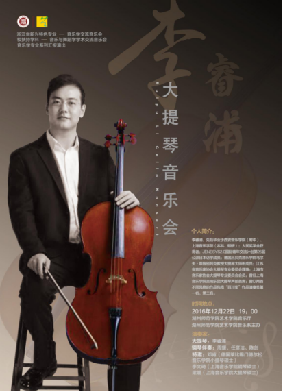 主办:湖州师范学院艺术学院承办: 湖州师范学院艺术学院音乐系时间:2016年12月22日 19:00地点:湖州师范学院艺术学院音乐厅