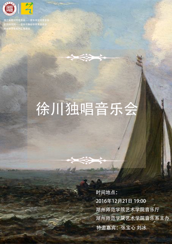 主办:湖州师范学院艺术学院承办: 湖州师范学院艺术学院音乐系时间:2016年12月21日19:00地点:湖州师范学院艺术学院音乐厅