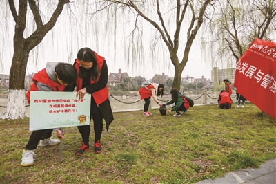 3月18日,湖州师范学院千余名志愿者分14支团队奔赴湖城14条河道的出入口和主河段周边开展水质监测、宣传劝导、净“画”河道等活动。在对选取的14条目标河流进行清洁与水质检测后,志愿者将绘制吴兴区水域水质地图,并分发给市民群众,加深其对周边河流河道水质改善的了解。图为活动现场。 (本报通讯员 朱孟浩 张皓一 李建纲 摄)