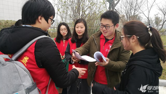 签约活动结束后,志愿者们吩咐各地,开展志愿活动。来自生科院、社会发展与管理学院的志愿者们来到了余家漾公园区域,取水样,检测附近河道水质,并在公园内发放手绘宣传传单进行宣讲,清捡垃圾,树立治水标语告示牌,以自己的实际行动,融入五水共治专项行动。