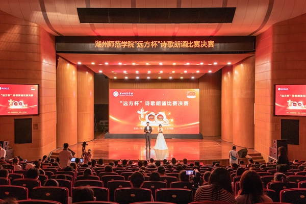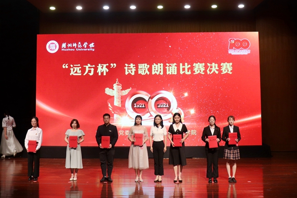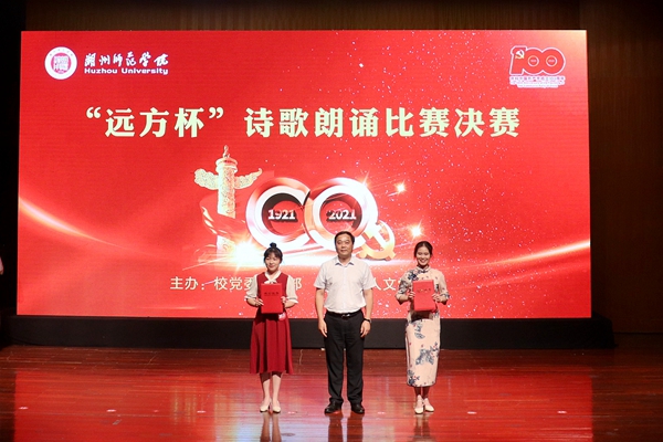 为庆祝中国共产党成立100周年,6月7日晚,由党委宣传部主办,人文学院承办的“远方杯”诗歌朗诵比赛决赛在中校区音乐厅举行。校党委副书记陈永华,党委委员、宣传部长杜宁出席。本次比赛邀请了原校党委副书记、“远方诗社”创始人杨柳,国家级普通话测试员、人文学院副教授苏向红,湖州市朗诵协会会长、国家一级播音员张云峰,湖州市朗诵协会理事、2019诗画浙江朗诵展演一等奖获得者霍磊磊作为嘉宾。