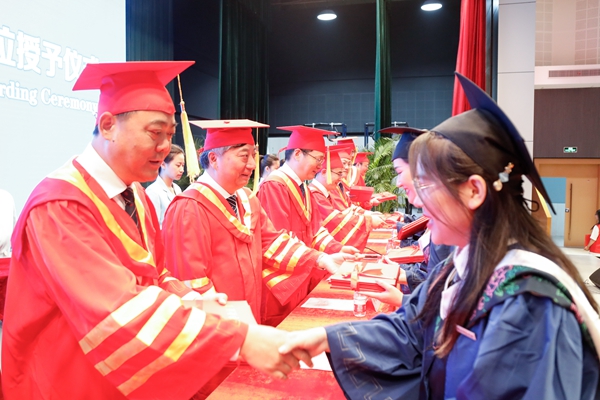 接下来是学位授予仪式。校党政领导班子为获得硕士学位的同学颁发硕士学位证书、拨穗并合影留念。