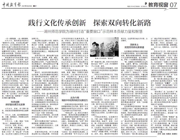 2021年6月29日,《中国教育报》以《践行文化传承创新 探索双向转化新路——湖州师范学院为湖州打造“重要窗口”示范样本贡献力量和智慧》为题报道我校近年来发展: