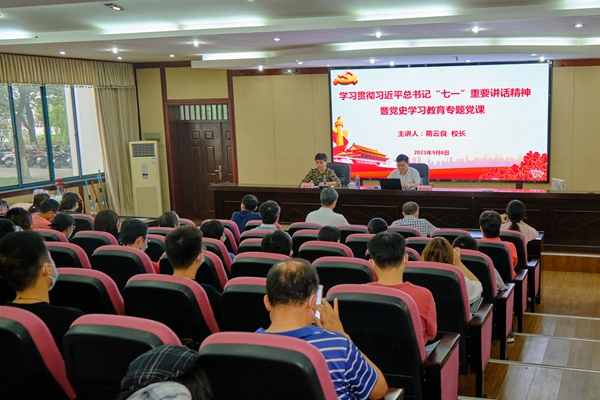 为深入推进党史学习教育,9月8日下午,机关党委研究生院党支部和工学院党委联合开展学习贯彻习近平总书记“七一”重要讲话精神暨党史学习教育专题党课活动。校长蒋云良讲授专题党课《奋进新征程 建功新时代——深入学习贯彻七一讲话精神 开创学校十四五发展新局面》。校研究生院、学科处全体人员,工学院领导班子成员、系部主任、全体教师党员和学生党员代表聆听了党课。