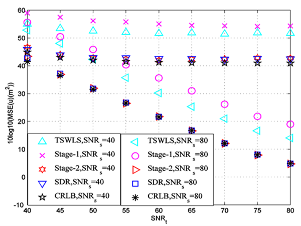 该成果提出了一种未知发射源信息的多输入多输出(Multiple-Input Multiple-Output,MIMO)雷达系统目标定位方法,该方法通过部署接收机和广泛存在的基站,无需基站的地理位置与时钟偏差信息,即可实现目标位置的精确定位,具有良好的应用前景。由于雷达系统目标定位问题的非线性特性,传统数值计算方法难以保证估计结果的全局收敛。因此该成果中也设计了两种有效的目标位置估计算法:代数解析法与凸优化松弛法,以保证结果收敛以及精度性能。同时分析比较两种算法的计算复杂度与精度性能,研究结果发现,在目标位置估计方面,两种不同算法的定位精度在高信噪比时都能接近最优性能。