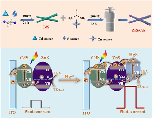 该论文研究一种基于CdS纳米线和ZnS量子点的光电化学传感平台,用于环境水样中汞离子的超低浓度的高灵敏检测。研究发现,所合成的ZnS/CdS异质结催化剂表现出优异的光电化学特性,其中CdS纳米线和ZnS量子点可分别作为光电化学传感检测过程中的光敏剂和Hg2+识别探针。由此构建的分析传感平台,在可见光下对Hg2+特异性地呈现出增强的光电流响应,原位形成的具有双type-Ⅱ型异质结构的HgS/ZnS/CdS复合物进一步增强了光电化学传感平台的光生电荷分离效率,线性响应范围为0.0010-5.0 nM,检测限低至0.40 pM。此外,通过对环境水体中Hg2+离子的检测,验证了构建的光电化学传感平台传感器的实际应用可行性。这种原位形成具有双type-Ⅱ型异质结构的方法可望在可见光驱动的光电化学传感检测平台设计方面获得广泛的应用。