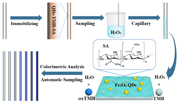 该研究报道了一种基于毛细管阵列和Fe3O4量子点(QDs)的高通量比色方法,并应用于牛奶中H2O2的分析。研究发现,采用溶剂热法和抗坏血酸刻蚀途径制备的Fe3O4 QDs具有比纳米Fe3O4颗粒更强的类过氧化物酶催化活性;特别是,当以海藻酸钠包覆Fe3O4 QDs后,所带的负电荷可增强其与底物TMB之间的亲和力,进一步提高了类酶催化活性;同时,海藻酸钠的包覆可保护并显著提高Fe3O4 QDs的环境稳定性;由此开发基于毛细管阵列的高通量比色平台,对牛奶中H2O2的检测线性范围为10-400 μM。此外,该平台利用毛细作用可实现多个样品的自动进样,可望在食品安全监测领域得到广泛的应用。