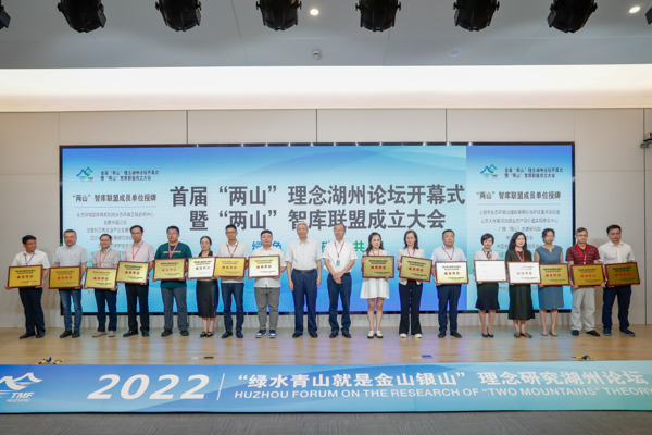 在“两山”研究智库联盟成立仪式上,刘青松宣布联盟成立,舒惠国和刘青松共同为“两山”研究智库联盟成员单位授牌。该联盟由湖州师范学院“两山”理念研究院、中国生态文明研究与促进会等21家单位共同发起组建。围绕“两山”转化、绿色发展与生态文明建设的重大理论与现实问题,协同开展理论研究、咨政建言、社会服务、人才培养、国际交流等工作,打造具有“中国特色、世界影响”的新型高端智库联盟。