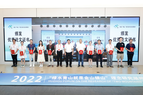 王瑞璞与金佩华为本次论坛优秀论文作者颁发证书。《小康》杂志社华东新闻中心主任周宇发布了《2022年湖州市绿色低碳生活指数报告——数字化改革助力百姓践行绿色低碳生活》。