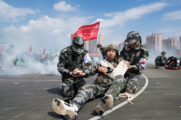 在历时两周的军事训练中,涌现出了一大批先进集体和个人。有精神风貌奖5个,内务优胜学院3个;队列会操学院12个;优秀组织奖4个、军训特别奖3个。人武部负责人宣读军训表彰文件,主席台领导为军训先进集体和个人进行颁奖。