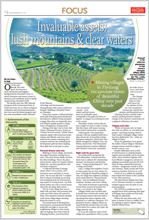 2022年9月20日,《环球时报》英文版第14版以《Invaluable assets:Lush mountains&clear waters》为题,报道我校党委书记、“两山”理念研究院院长金佩华关于“两山”理念的有关观点。稿件同步在推特、脸书以及《环球时报》英文版官方英文网站等媒体平台上推出。具体如下: