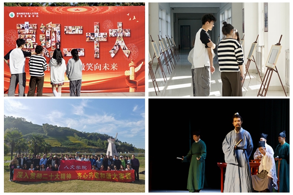 人文学院通过线上和线下结合的方式,举办了“喜迎二十大,笔墨绘中华”红色经典书法展、“青春献礼二十大,强国有我新征程”人文学子云传诵短视频大赛、“永远跟党走,微笑向未来”百张笑脸展等系列活动,掀起学习宣传贯彻二十大精神的热潮。学院还组织全体教工开展“深入贯彻二十大精神 齐心共建和谐大家庭”外出研学活动;各团支部开展了“学习党的二十大,追忆千年湖学史”活动,学生社团启明剧社推出特别演出活动《君子胡瑗》。