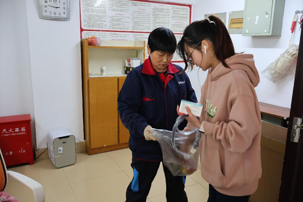 姚海英觉得与学生们共度的时光是快乐且值得回味的。她总会带着微笑和同学打招呼,把自己家里做的饭菜与同学们分享,帮同学们翻晒被子。一件件微不足道却又充满爱的小事,都在潜移默化中感动着每一位学生。同学们也会热情回应每一份温暖,路过时向姚阿姨主动问好、和姚阿姨一起分享美食。“我把30幢的每一个女学生都当成我的孩子,看到她们开心的样子我会感到无比幸福。”渐渐地,这些充满爱的小事和问候的话语,使姚海英与30幢同学之间的感情更加深厚,她们共同营造出温馨又美好的宿舍环境。