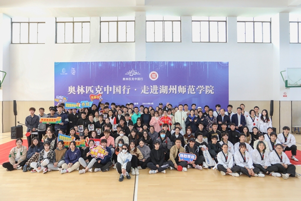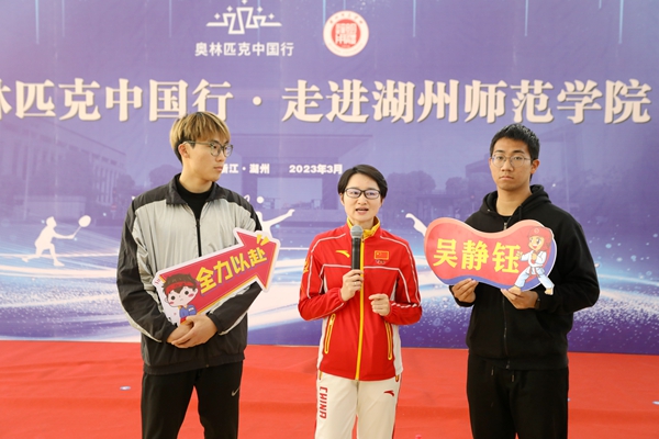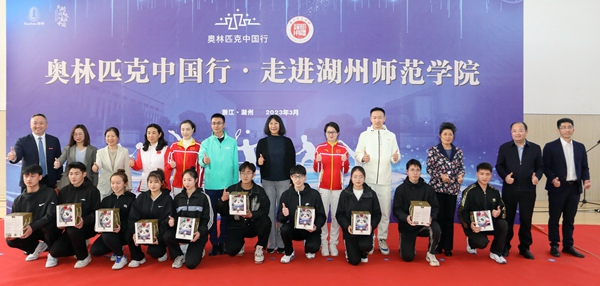3月28日下午,“奥林匹克中国行”走进湖州师范学院活动隆重举行。国际奥委会文化遗产委员会委员侯琨,中国羽毛球协会副主席、羽毛球世界冠军唐九红,跳水奥运冠军吴敏霞、跆拳道奥运冠军吴静钰、乒乓球奥运冠军乔红、羽毛球奥运冠军张楠在吴兴区人大常委会党组书记、主任王树,吴兴区委常委、宣传部长朱小芳陪同下莅临我校参观指导。我校副校长潘音,党委委员、党校办主任劳士健接待了奥运冠军及嘉宾一行,党校办、宣传部、学生处、团委、体育学院相关负责人及300余名师生参加了活动。