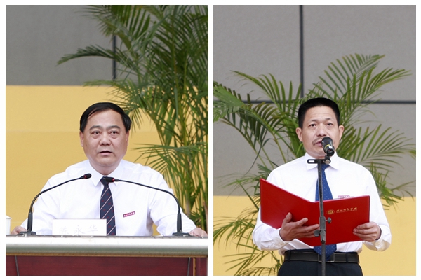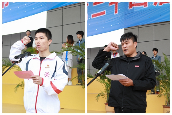 裁判员代表、体育学院教师金志鸿,运动员代表、工学院学生邱俊鑫分别郑重宣誓。