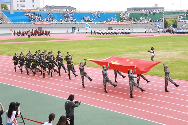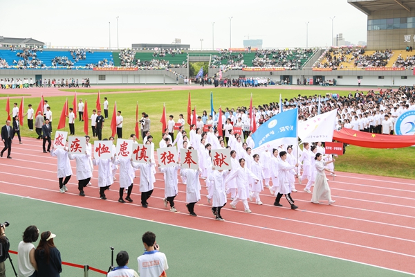 伴随着雄壮的《运动员进行曲》,国旗护卫队、校运动会会徽队以及全体裁判员、运动员迈着整齐的步伐,精神饱满地步入运动场。各代表队的队列方阵依次走过主席台前,向师生们展现了各学院的靓丽风采。