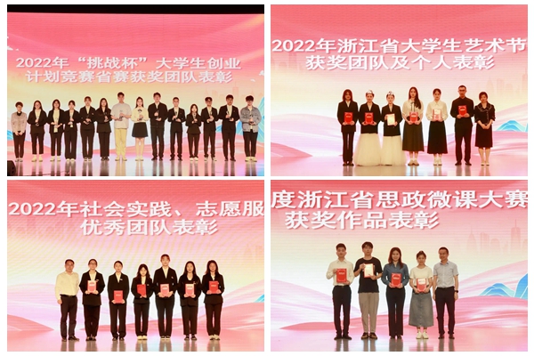 活动现场对过去一学年为学校改革发展贡献青春力量的师生和团队进行了隆重表彰,与会领导为全国“挑战杯”大学生创业计划竞赛铜奖获得者、浙江省“挑战杯”大学生创业计划竞赛金、银、铜奖等40余名获奖代表颁发证书和奖章。