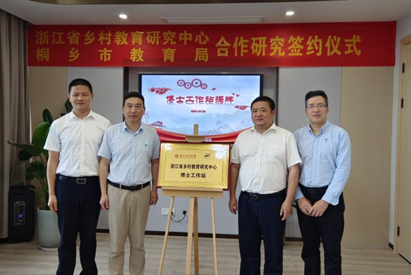双方共同签订了《共富背景下桐乡市乡村学校高质量发展实践探索》合作研究协议,并为合作学校挂牌浙江省乡村教育研究中心博士工作站。今后,中心将以博士工作站为载体,指导学校发展规划的研制工作和教师成长的培养计划等工作。