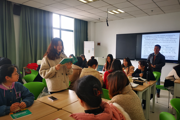 在中国文化概要课程的教学中,段自力将优秀传统文化的讲授与其在当代社会中的价值结合,引导学生关注传统文化的当代价值。在理论教学中,他也注重挖掘翻译知识中蕴藏的价值元素。通过译理、译技、译史、译家、译事、译训的讲授,他指导学生阅读译家故事、体验翻译事件、撰写学习心得。他讲述莎剧翻译家朱生豪不顾自身贫病交加,在战火纷飞的20世纪三四十年代,以一己之力,完成第一部中译莎士比亚戏剧全集的历程,并引导学生课后阅读《朱生豪传》等相关资料,体悟朱生豪的使命感和责任感。他以翻译家严复1898年翻译出版《天演论》为例,与学生一起研讨严复采取非正法的“达旨”译法翻译《天演论》的价值追求。教师提供任务支架,学生小组合作、课前查阅相关资料、课中汇报讨论、课后学习通提交成果,通过体验式学习,引导学生内化翻译知识,培养运用知识的能力,感受翻译家的爱国情怀和责任担当。