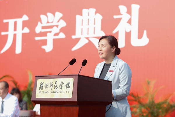 典礼上,许慧霞以《大道如砥 行者无疆》为题寄语新生,代表学校对2023级新同学表示热烈欢迎。她说:“天下汤汤,道路万千。来自五湖四海的新同学们沿着不同的道路汇聚湖师,道路将我们与你们相连,将梦想与现实相连,也将过去、现在与未来相连。”她以“道路”二字切入主题,并引申出“道”,指出“道”是轨迹、是行动、亦是真理。同学们正是用自己的脚步追随着中华民族的复兴之路、强国之路。作为师长,许慧霞与新同学们分享了三点建议:一是矢志不移,坚守天下为公的人生之道。一代代湖师人奋斗在国家经济社会建设的各条赛道上,创造了巨大的社会价值。同学们要以前行者为榜样,厚植家国情怀、勇担时代使命,用脚步丈量祖国大地,用眼睛发现中国精神,用耳朵倾听人民呼声,用内心感应时代脉搏,用青春之履在祖国大地上留下最坚定、最踏实的足迹。二是勤学不怠,走好成长成才的大学之道。“大学之道,在明明德,在亲民,在止于至善。”大学的正道,就是通过正己修身、格物致知来革新自我与民众,并努力达到尽善尽美的境界。大学之道绝非单一局限、一马平川,学校搭建了高度个性化的人才培养体系和“一站式”学生社区与成长陪伴智慧平台,帮助大家充分开阔学术视野,开拓出属于自己的最优成长路径。三是步履不停,踏上拥抱未知的突破之道。当前世界百年未有之大变局加速演进,不断扩大的未知圈时刻都在呼唤新的变革与突破。同学们生逢其时,走在强国建设、民族复兴的康庄大道上,重任在肩,愿同学们不忘来时路、不负今朝景,踔厉奋发、笃行不怠,让青春在为祖国、为人民、为民族、为人类的人间正道中绽放出更加绚丽的光彩。