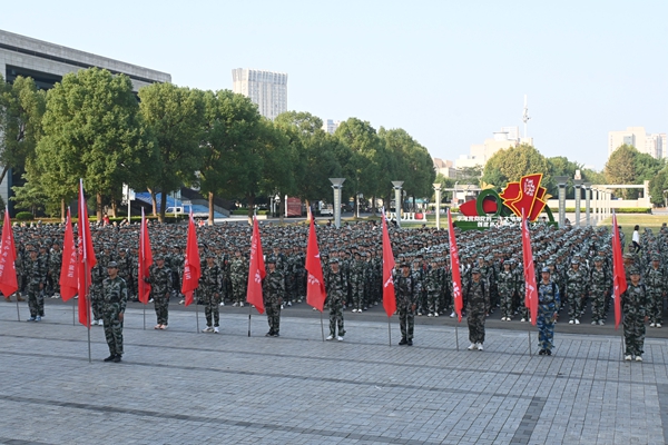 全体新生于早上8点整队集结完毕,队列井然,蓄势待发。军训团团长郭东旭号令出发,军训领导小组成员和全体教导员随队前行,为同学们保驾护航。